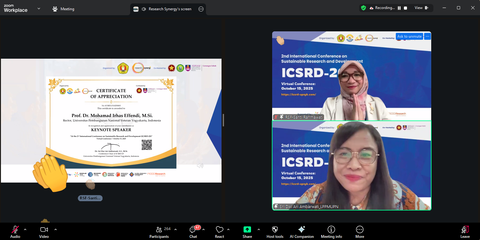 Yogyakarta, 15 Oktober 2025 – 2nd International Conference on Sustainable Research and Development (ICSRD-25) telah sukses diselenggarakan, menandai tonggak penting dalam upaya global mencapai pembangunan berkelanjutan. Konferensi virtual ini pada hari ini mengusung tema utama: “Resilience through Integration: Interdisciplinary Approaches to Energy Sustainability, Food Security, and National Defence”. Dengan kolaborasi antara LPPM Universitas Pembangunan Nasional “Veteran” Yogyakarta dan Research Synergy Foundation, dengan dukungan kemitraan strategis dari Polytechnic University of the Philippines (PUP), Municipality of Pulilan, Bulacan, Philippines, dan Universiti Teknologi MARA (UiTM) Cawangan Sabah Malaysia. Acara ini berhasil menjadi platform multidisipliner yang mempertemukan para peneliti, dan praktisi dari berbagai institusi dunia