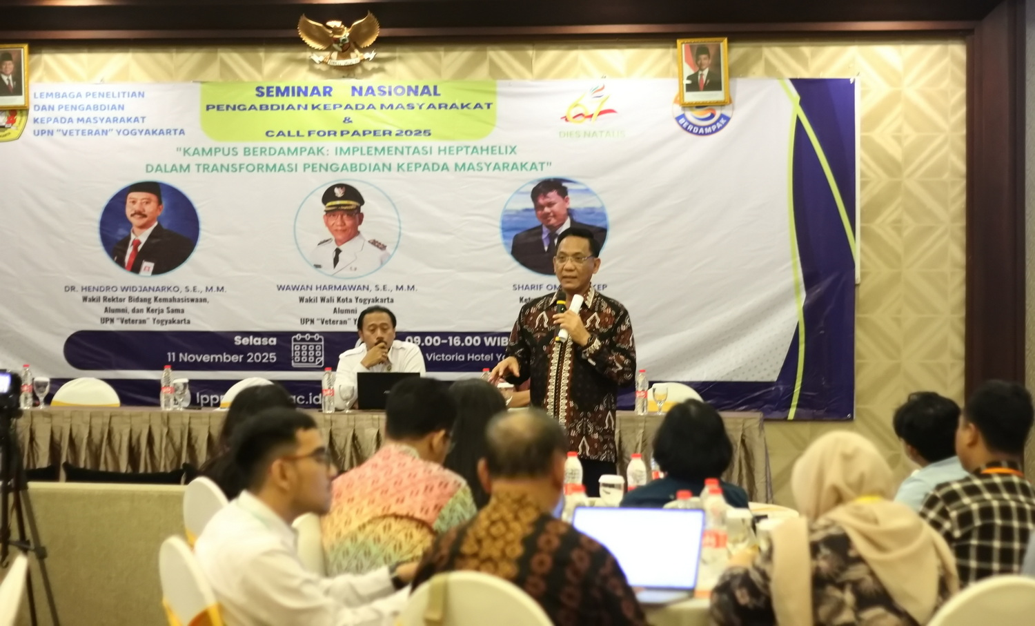 Acara dibuka secara resmi oleh Rektor UPN "Veteran" Yogyakarta, Prof. Dr. Mohamad Irhas Effendi, M.Si. dalam pembukaan, Rektor menegaskan bahwa tema "Kampus Berdampak" ini selaras dengan visi Bela Negara universitas, menekankan perlunya Perguruan Tinggi bertransformasi dari sekadar penyedia ilmu menjadi produsen solusi nyata melalui praktik pengabdian yang kolaboratif dan aplikatif. Setelah pembukaan, sesi inti dilanjutkan dengan seminar utama yang menampilkan narasumber berkapasitas tinggi dari berbagai unsur Heptahelix.