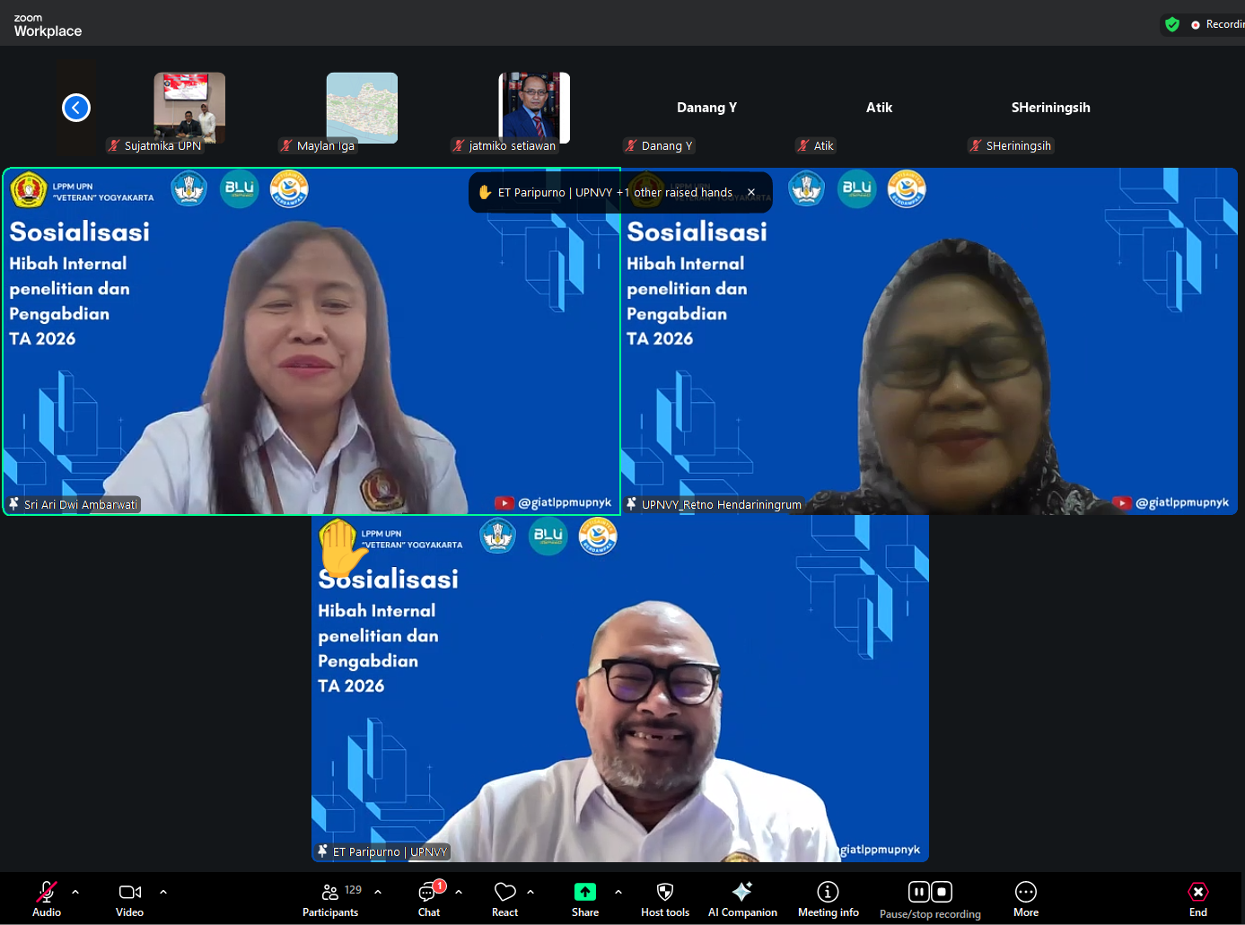 YOGYAKARTA – Lembaga Penelitian dan Pengabdian kepada Masyarakat (LPPM) UPN "Veteran" Yogyakarta menyelenggarakan kegiatan "Sosialisasi Hibah Penelitian dan Pengabdian kepada Masyarakat Internal untuk Tahun Anggaran 2026". Acara ini dilaksanakan secara daring melalui platform Zoom dan YouTube resmi Giat LPPM UPNYK guna memberikan pemahaman mendalam bagi para dosen mengenai skema dan kebijakan terbaru.